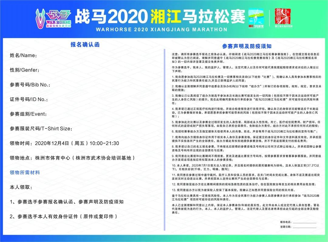 3、参赛者需携带本人二代身份证原件/复印件、到物品发放处签署《报名确认函》、《参赛声明及防疫须知》后,方可领取物资。